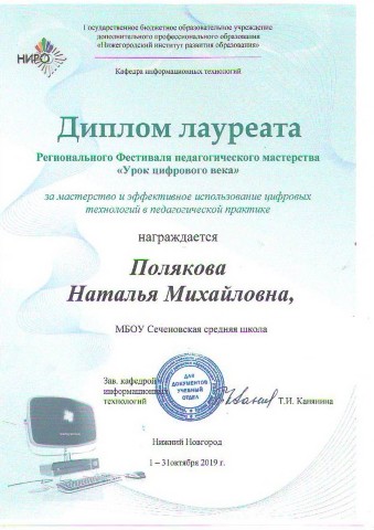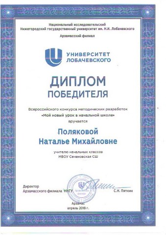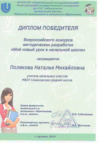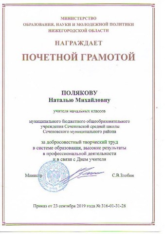 Почетная грамота за участие в муниципальном этапе Всероссийского конкурса "Учитель года России", занявшую I место